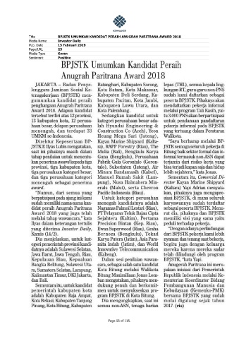 Title BPJSTK UMUMKAN KANDIDAT PERAIH ANUGRAH PARITRANA AWARD 2018 Media Name Investor Daily Pub. Date 15 Februari 2019 Page/URL 23 Media Type Koran Sentiment Positive Page 56 of 115.