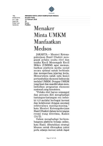 Title MENAKER MINTA UMKM MANFAATKAN MEDSOS Media Name Investor Daily Pub. Date 15 Februari 2019 Page/URL 21 Media Type Koran Sentiment Positive Page 57 of 115.