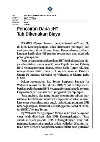 Title PENCAIRAN DANA JHT TAK DIKENAKAN BIAYA Media Name Koran Jakarta Pub. Date 15 Februari 2019 Page/URL 4 Media Type Koran Sentiment Positive Page 59 of 115.