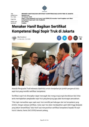 Title MENAKER HANIF BAGIKAN SERTIFIKAT KOMPETENSI BAGI SOPIR TRUK DI JAKARTA