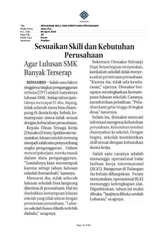 Title SESUAIKAN SKILL DAN KEBUTUHAN PERUSAHAAN Media Name Jawa Pos Pub. Date 08 April 2019 Page/URL 29 Media Type Koran Sentiment Positive Page 16 of 83.