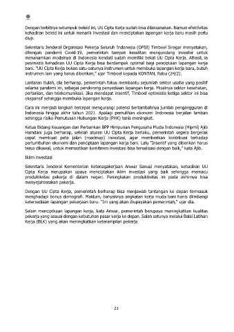 bani. "UU Cipta Kerja bukan satu-satunya instrumen untuk membuka lapangan kerja baru, butuh