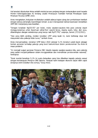 Anies menyampaikan, kenaikan UMP tahun 2022 sebesar 5,1% tersebut sudah layak sebagai