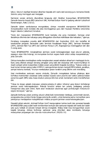 (JKM), Jaminan Hari Tua (JHT) dan Jaminan Pensiun (JP). Kepergiannya meninggalkan istri dan