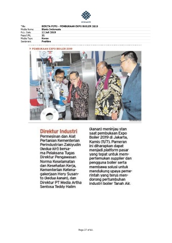 Title BERITA FOTO - PEMBUKAAN EXPO BOILER 2019 Media Name Bisnis Indonesia Pub. Date 12 Juli 2019 Page/URL 21 Media Type Koran Sentiment Positive Page 27 of 61.