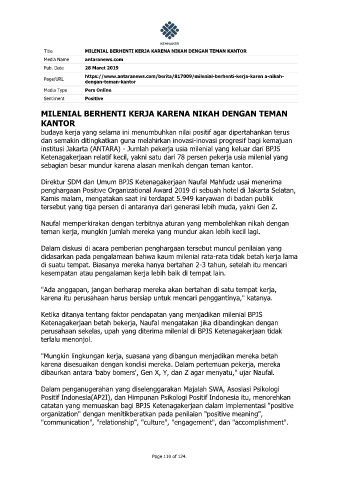 penghargaan Positive Organizational Award 2019 di sebuah hotel di Jakarta Selatan,