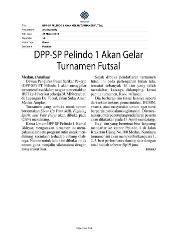 Title DPP-SP PELINDO 1 AKAN GELAR TURNAMEN FUTSAL Media Name Analisa Daily Pub. Date 28 Maret 2019 Page/URL 13 Media Type Koran Sentiment Positive Page 35 of 124.