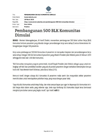 Title PEMBANGUNAN 500 BLK KOMUNITAS DIMULAI Media Name koran-jakarta.com Pub. Date 28 Maret 2019 Page/URL http://www.koran-jakarta.com/pembangunan-500-blk-komunitas-dimulai/ Media Type Pers Online Sentiment Positive Page 88 of 124.