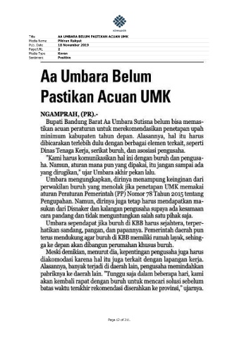 Title AA UMBARA BELUM PASTIKAN ACUAN UMK Media Name Pikiran Rakyat Pub. Date 18 November 2019 Page/URL 2 Media Type Koran Sentiment Positive Page 12 of 211.