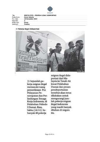 Title BERITA FOTO - PEKERJA ILEGAL DIDEPORTASI Media Name Koran Jakarta Pub. Date 18 November 2019 Page/URL 2 Media Type Koran Sentiment Positive Page 15 of 211.