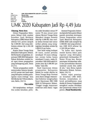 Title UMK 2020 KABUPATEN JADI RP 4,49 JUTA Media Name Warta Kota Pub. Date 18 November 2019 Page/URL 8 Media Type Koran Sentiment Positive Page 19 of 211.