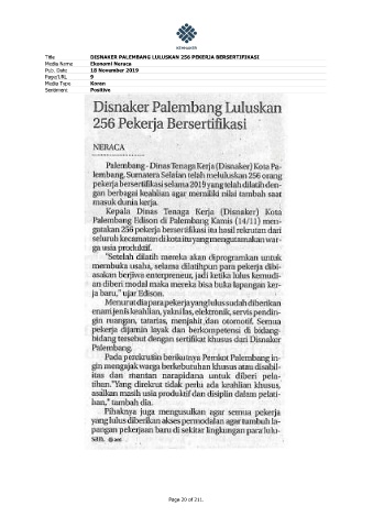 Title DISNAKER PALEMBANG LULUSKAN 256 PEKERJA BERSERTIFIKASI Media Name Ekonomi Neraca Pub. Date 18 November 2019 Page/URL 9 Media Type Koran Sentiment Positive Page 20 of 211.