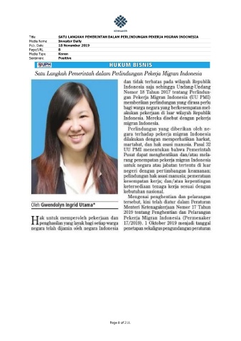 Title SATU LANGKAH PEMERINTAH DALAM PERLINDUNGAN PEKERJA MIGRAN INDONESIA Media Name Investor Daily Pub. Date 18 November 2019 Page/URL 8 Media Type Koran Sentiment Positive Page 8 of 211.
