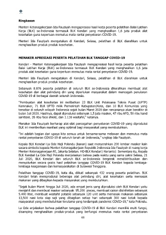 menyalurkan secara gratis hasil pelatihan tanggap COVID-19 BLK Kendari kepada lembaga-
