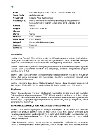 Judul Kemnaker Bagikan 1,6 Juta Alkes Covid-19 Produksi BLK