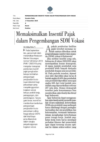 Title MEMAKSIMALKAN INSENTIF PAJAK DALAM PENGEMBANGAN SDM VOKASI Media Name Investor Daily Pub. Date 17 Desember 2019 Page/URL 4 Media Type Koran Sentiment Positive Page 4 of 124.