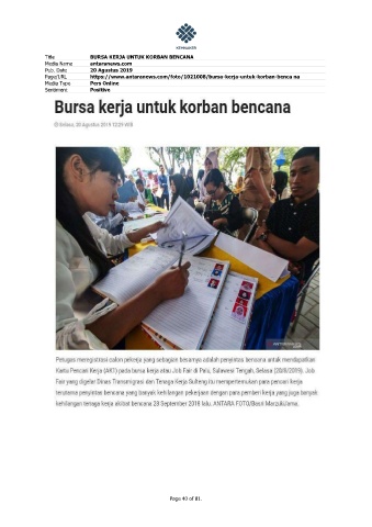 Title BURSA KERJA UNTUK KORBAN BENCANA Media Name antaranews.com Pub. Date 20 Agustus 2019 Page/URL https://www.antaranews.com/foto/1021008/bursa-kerja-untuk-korban-benca na Media Type Pers Online Sentiment Positive Page 40 of 81.
