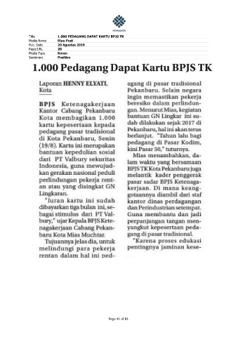 Title 1.000 PEDAGANG DAPAT KARTU BPJS TK Media Name Riau Post Pub. Date 20 Agustus 2019 Page/URL 20 Media Type Koran Sentiment Positive Page 41 of 81.