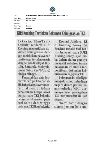 Title KJRI KUCHING TERTIBKAN DOKUMEN KEIMIGRASIAN TKI Media Name Harian Terbit Pub. Date 01 Juli 2019 Page/URL 3 Media Type Koran Sentiment Positive Page 22 of 40.