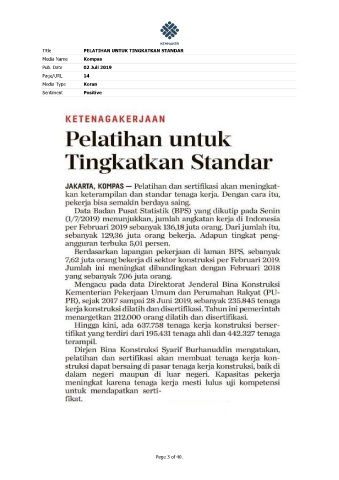Title PELATIHAN UNTUK TINGKATKAN STANDAR Media Name Kompas Pub. Date 02 Juli 2019 Page/URL 14 Media Type Koran Sentiment Positive Page 3 of 40.