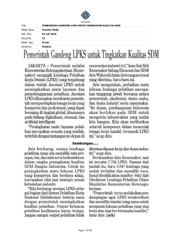 Title PEMERINTAH GANDENG LPKS UNTUK TINGKATKAN KUALITAS SDM Media Name Investor Daily Pub. Date 02 Juli 2019 Page/URL 21 Media Type Koran Sentiment Positive Sambungan….. Page 5 of 40.