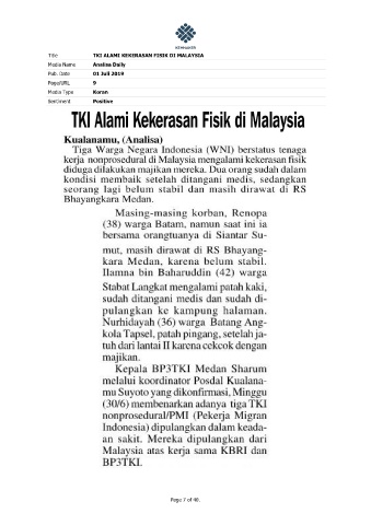 Title TKI ALAMI KEKERASAN FISIK DI MALAYSIA Media Name Analisa Daily Pub. Date 01 Juli 2019 Page/URL 9 Media Type Koran Sentiment Positive Page 7 of 40.