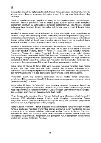 pelaksanaan ketentuan UU Cipta Kerja dan peraturan pelaksanaannya," kata Menaker Ida saat