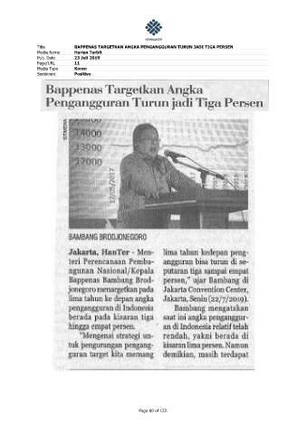 Title BAPPENAS TARGETKAN ANGKA PENGANGGURAN TURUN JADI TIGA PERSEN Media Name Harian Terbit Pub. Date 23 Juli 2019 Page/URL 11 Media Type Koran Sentiment Positive Page 60 of 122.