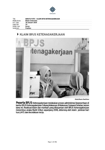 Title BERITA FOTO - KLAIM BPJS KETENAGAKERJAAN Media Name Bisnis Indonesia Pub. Date 28 Januari 2019 Page/URL 18 Media Type Koran Sentiment Positive Page 1 of 248.
