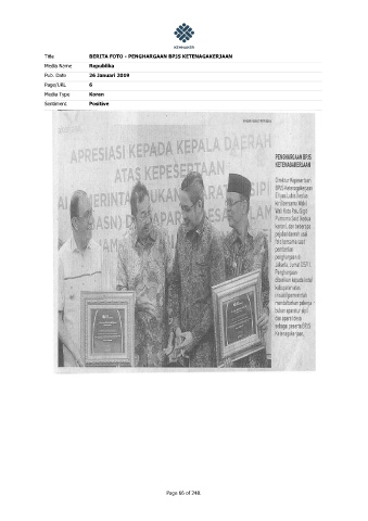 Title BERITA FOTO - PENGHARGAAN BPJS KETENAGAKERJAAN Media Name Republika Pub. Date 26 Januari 2019 Page/URL 6 Media Type Koran Sentiment Positive Page 66 of 248.