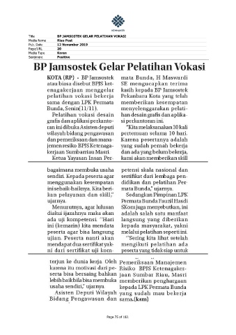 Title BP JAMSOSTEK GELAR PELATIHAN VOKASI Media Name Riau Post Pub. Date 12 November 2019 Page/URL 20 Media Type Koran Sentiment Positive Page 75 of 182.