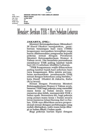Title MENAKER: BERIKAN THR 7 HARI SEBELUM LEBARAN Media Name Pikiran Rakyat Pub. Date 10 Mei 2019 Page/URL 17 Media Type Koran Sentiment Positive Page 11 of 80.