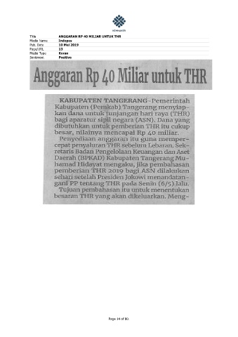 Title ANGGARAN RP 40 MILIAR UNTUK THR Media Name Indopos Pub. Date 10 Mei 2019 Page/URL 13 Media Type Koran Sentiment Positive Page 14 of 80.
