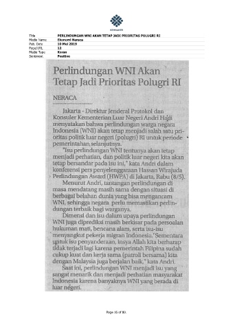 Title PERLINDUNGAN WNI AKAN TETAP JADI PRIORITAS POLUGRI RI Media Name Ekonomi Neraca Pub. Date 10 Mei 2019 Page/URL 12 Media Type Koran Sentiment Positive Page 16 of 80.