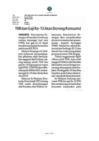 Title THR DAN GAJI KE-13 AKAN DORONG KONSUMSI Media Name Koran Sindo Pub. Date 09 Mei 2019 Page/URL 15 Media Type Koran Sentiment Positive Page 27 of 80.