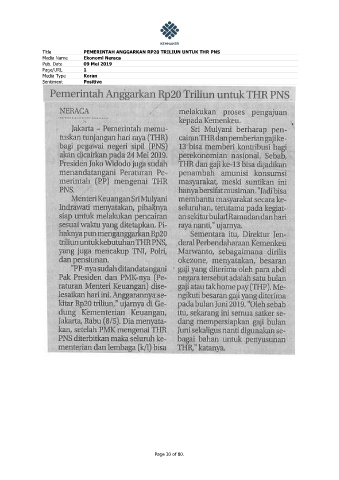 Title PEMERINTAH ANGGARKAN RP20 TRILIUN UNTUK THR PNS Media Name Ekonomi Neraca Pub. Date 09 Mei 2019 Page/URL 1 Media Type Koran Sentiment Positive Page 30 of 80.