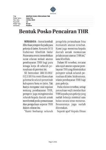Title BENTUK POSKO PENCAIRAN THR Media Name Jawa Pos Pub. Date 10 Mei 2019 Page/URL 11 Media Type Koran Sentiment Positive Page 5 of 80.