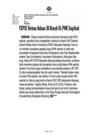 Title FSPSI TERIMA ADUAN 30 BURUH DI-PHK SEPIHAK Media Name Pikiran Rakyat Pub. Date 10 Mei 2019 Page/URL 4 Media Type Koran Sentiment Negative Page 7 of 80.