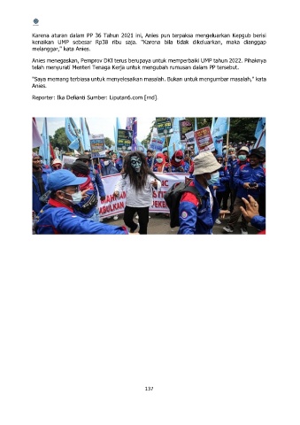 Anies menegaskan, Pemprov DKI terus berupaya untuk memperbaiki UMP tahun 2022. Pihaknya