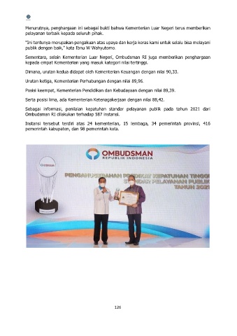 Sementara, selain Kementerian Luar Negeri, Ombudsman RI juga memberikan penghargaan