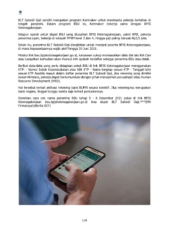 tengah pandemi. Dalam program BSU ini, Kemnaker bekerja sama dengan BPJS