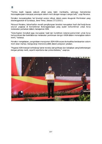 Menaker menyampaikan hal tersebut secara virtual, dalam acara Anugerah Meritokrasi yang