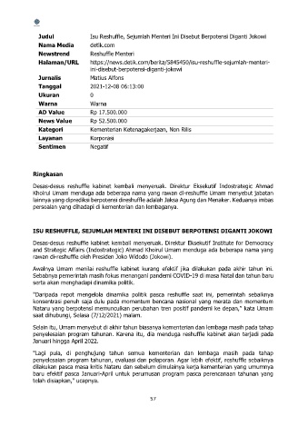 Desas-desus reshuffle kabinet kembali menyeruak. Direktur Eksekutif Indostrategic Ahmad