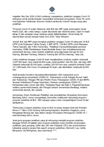 Jumlah BLK dan BPP yang mengikuti pelatihan tanggap Covid-19 sebanyak 19 BLK