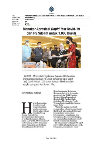 Title MENAKER APRESIASI RAPID TEST COVID-19 DARI RS SILOAM UNTUK 1.000 BURUH Media Name Investor Daily Pub. Date 02 Mei 2020 Page/URL 20 Media Type Koran Sentiment Positive Page 250 of 695.