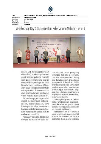 Title MENAKER: MAY DAY 2020, MOMENTUM KEBERSAMAAN MELAWAN COVID-19 Media Name Media Indonesia Pub. Date 02 Mei 2020 Page/URL 3 Media Type Koran Sentiment Positive Page 258 of 695.