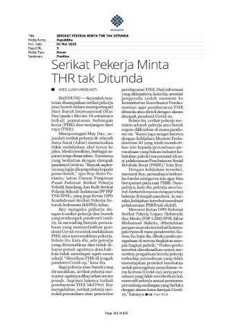 Title SERIKAT PEKERJA MINTA THR TAK DITUNDA Media Name Republika Pub. Date 02 Mei 2020 Page/URL 3 Media Type Koran Sentiment Positive Page 269 of 695.
