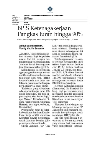 Title BPJS KETENAGAKERJAAN PANGKAS IURAN HINGGA 90% Media Name Kontan Pub. Date 02 Mei 2020 Page/URL 2 Media Type Koran Sentiment Positive Page 276 of 695.