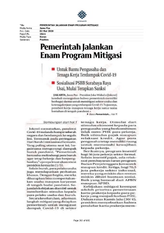 Title PEMERINTAH JALANKAN ENAM PROGRAM MITIGASI Media Name Jawa Pos Pub. Date 02 Mei 2020 Page/URL 1&11 Media Type Koran Sentiment Positive Page 282 of 695.