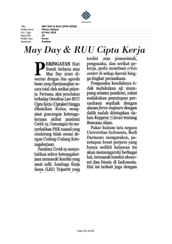 Title MAY DAY & RUU CIPTA KERJA Media Name Pikiran Rakyat Pub. Date 02 Mei 2020 Page/URL 15 Media Type Koran Sentiment Positive Page 290 of 695.